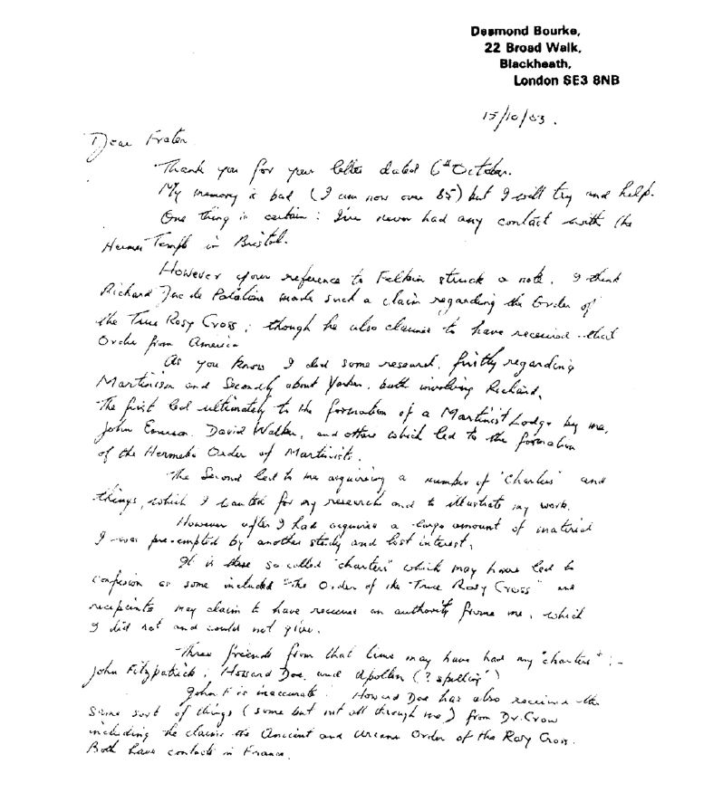 Ingenstans i detta brev kan vi utläsa några bevis för att Desmond Bourke skulle förneka sina Golden Dawn-relaterade härkomster, utan endast att han har svårt att minnas detaljerna kring vissa av sina härkomster och hurvida de relaterar till Golden Dawn eller inte, vilket han alltså ett decennium tidigare har kunnat göra utan problem muntligen till dem som har emottagit dem. I brevet är Bourke medvetet vag som om han försöker sopa igen spåren till sina Golden Dawn-härkomster. I brevet antyder han om att en överföring av en härkomst har skett bl.a. till Appolon Leontas. Vi kan dock inte utläsa av brevet exakt vilka dessa härkomster är. Ingenting här i brevet säger att dessa ens har något med G∴D∴ eller A∴O∴ att göra. De enda ordenssällskap som nämns har ”Rosy Cross” i sina namn, inte ”Golden Dawn” eller ”Alpha Omega” vilket har hävdats av belackarna. Vad man kan utläsa av Bourkes ord är att han förnekar sin rätt att förmedla ett priviligiebrev för “The Order of the True Rosy Cross”, en högst irrelevant grupp i sammanhanget.