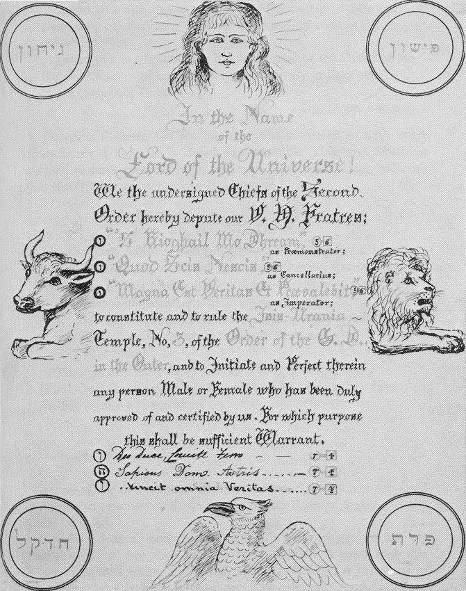 Ett ”?” med en heldragen linje är lagt till Hermetiska Orden av Den Gryende Morgonrodnaden bara för att förtydliga att vårt Modertempel innehar Hermetiska härkomster och auktorisationer av väsentlig art som inte är för den yttre världen att känna till. Dessa kommer för all framtid att vara förborgade för offentligheten att ha någon kännedom om och även vara okända för våra medlemmar tills de har nått en tillräcklig senioritet i vår Orden.