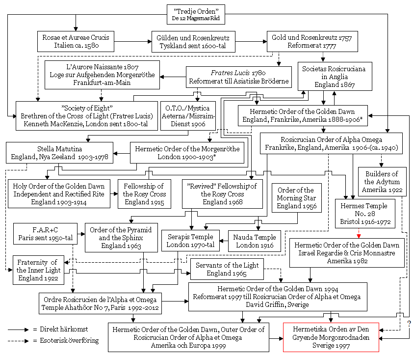 En röd rektangel markerar platsen för Hermetiska Orden av Den Gryende Morgonrodnaden på detta släktträd, såsom utgörandes en avknoppning ur Rosenkors-Orden, Alpha et Omega.
